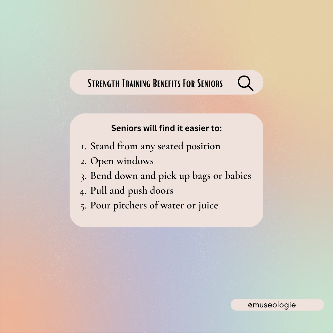 ADL are activities of daily living and as a person ages, ADLs can become increasingly difficult. As I’ve been training seniors, I make sure to include MANY functional strength training moves as it helps with ADLs. Below is a graphic of benefits I’ve heard from my seniors over the past year.